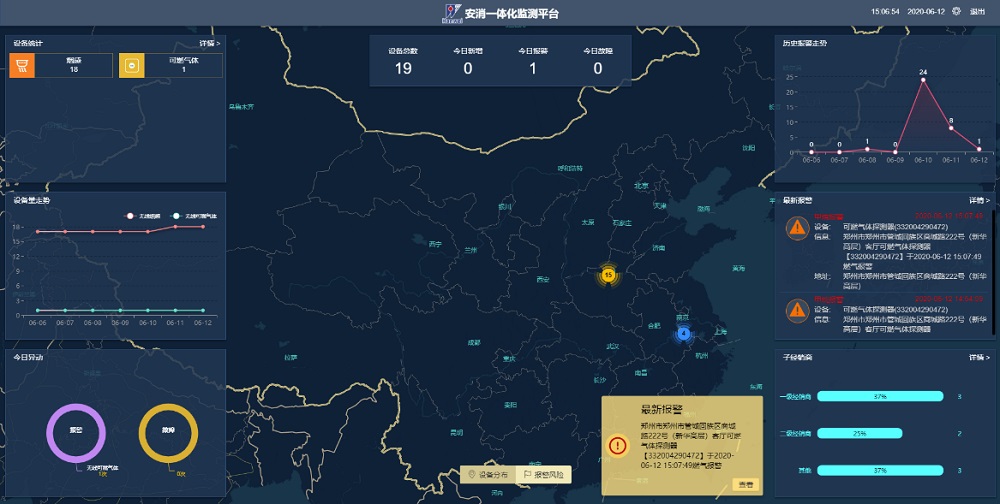 目前对社区的用电安全、用气安全、火灾自动报警、消火栓的水压监控等关系民生安全的基础类设施进行联网,同时利用物联网、大数据等技术分析,能够有效的监控社区内的火灾情况,并且通过各级监管平台实现多级监管,数据对接到公安、消防、安监、应急等大数据平台当中实现多级部门的联动。对于日常消防维护过程中的消防隐患排查,进行拍照取证、并整改。