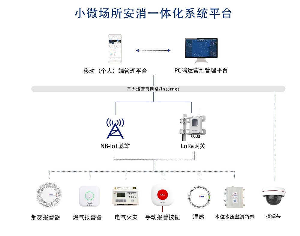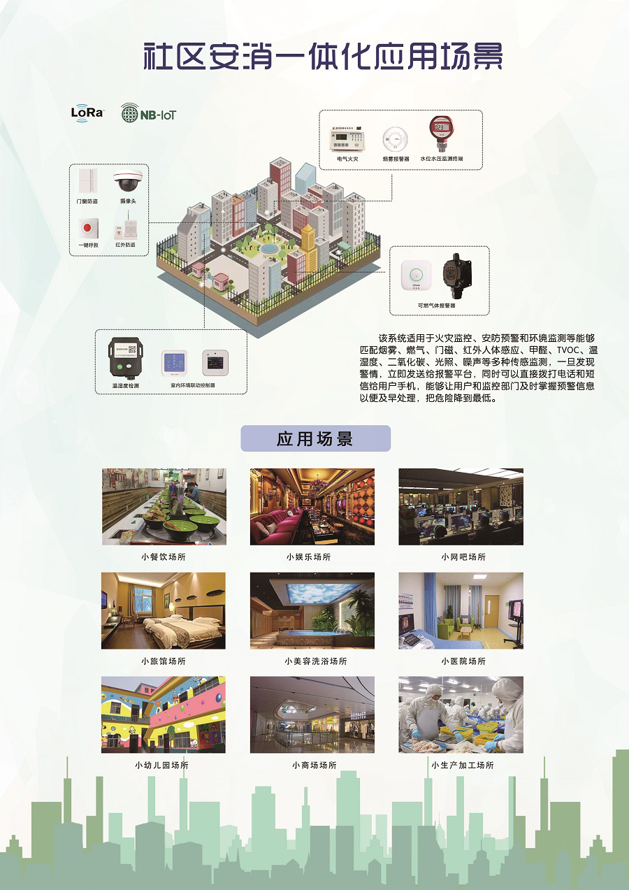 对社区内的家庭以及商铺、三合一场所,采用智能火灾自动报警设备(智慧烟感、智慧用电、燃气报警器)采集底层火灾数据,通过数据传输到各个监管部门的云平台,同时监管单位巡检人员通过手机微信小程序进行设备巡检、维保以及隐患排查、上报到监管单位,进行隐患的追踪处理。商户个人通过手机电话、短信、微信进行警情接收,从设备报警到各方联动只需要 15S ,以保证火警的各方监管、早发现、早处理、极大的减少人员伤亡以及财产损失。