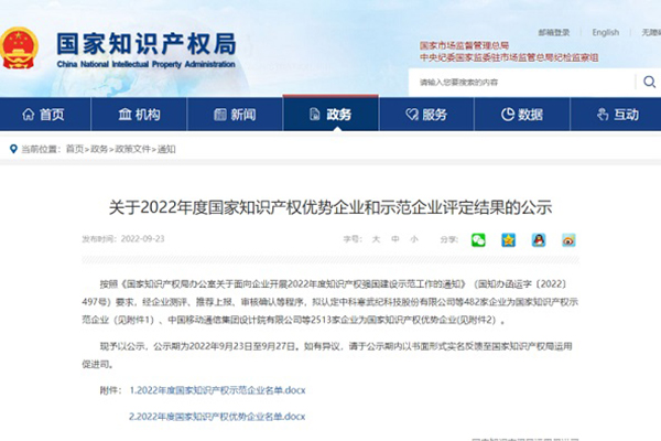 9月23日,国家知识产权局发布《关于2022年度国家知识产权优势企业和示范企业评定结果的公示》。公示显示,按照《国家知识产权局办公室关于面向企业开展2022年度知识产权强国建...