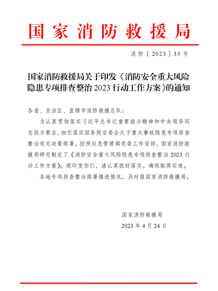 4月24日,国家消防救援局印发《消防安全重大风险隐患专项排查整治2023行动工作方案》,部署在全国集中开展消防安全重大风险隐患专项排查整治2023行动,全面摸清并动态掌握现阶段消防安全重大风险隐患底数,落实严格的安全防范措施,有效降低火灾风险,坚决遏制群死群伤重特大火灾事故发生。
