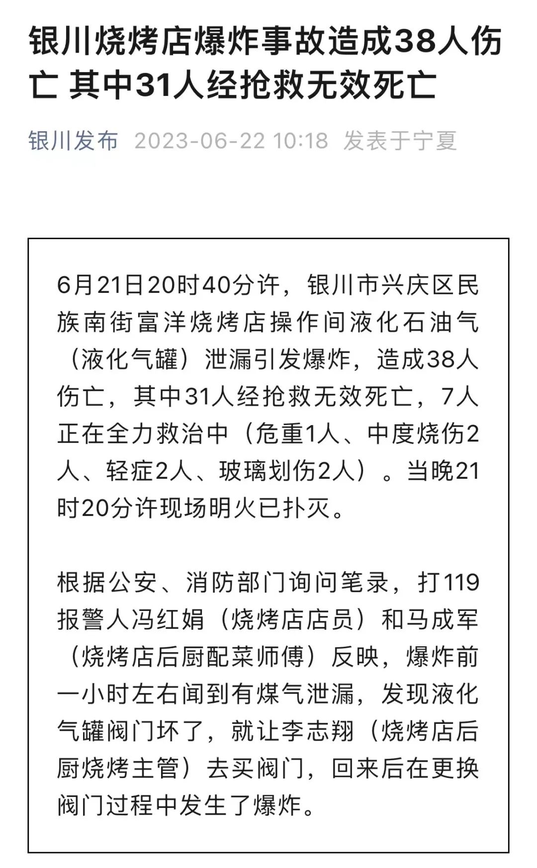 据“银川发布”消息,根据公安、消防部门询问笔录: 打119报警人冯红娟(烧烤店店员)和马成军(烧烤店后厨配菜师傅)反映,爆炸前一小时左右闻到有煤气泄漏,发现液化气罐阀门坏了,就让李志翔(烧烤店后厨烧烤主管)去买阀门,回来后在更换阀门过程中发生了爆炸。