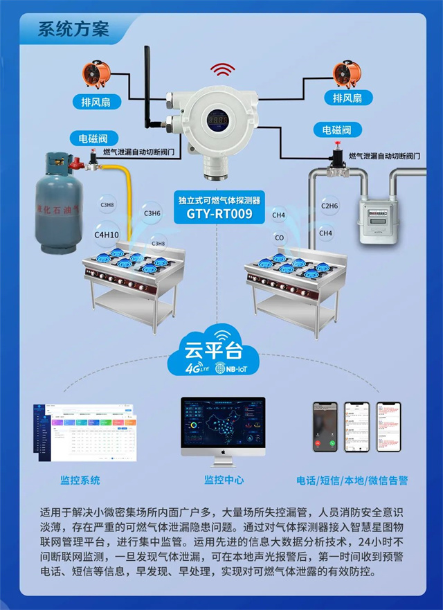 方案可联网报警加现场声光报警进行关闭阀门切断气源,报警信息可发送至手机可上传至监管平台。
