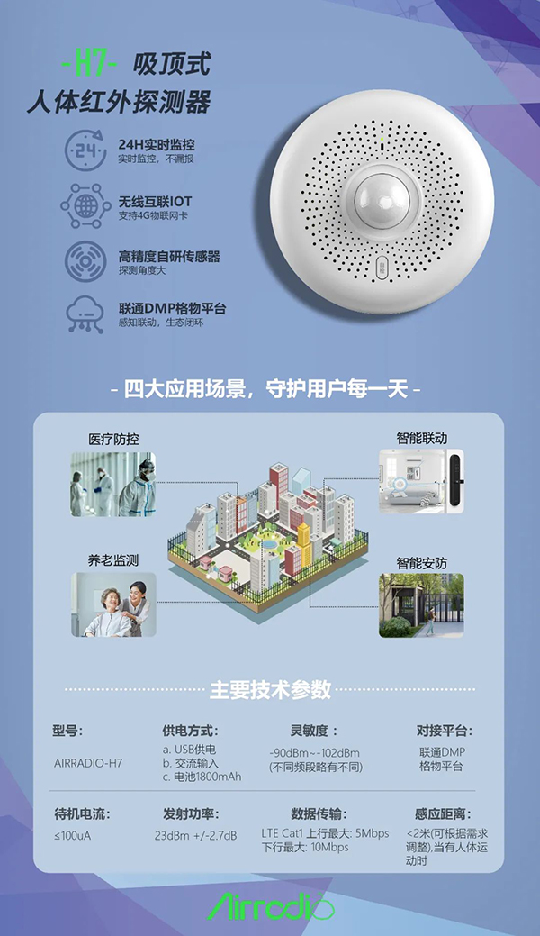 吸顶式⼈体红外探测器是通过红外探测头在⼀定距离内隔空检测⼈体活动状态,通过本设备数据采集处理后形成各种告警或者事件上传平台,可使用于智能安防,养老监测等应用场景。