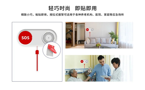 免布线安装,即贴即用,确定安装位置后用双面胶固定或者用螺丝挂壁安装,拆装、移动也非常方便,广泛应用于家庭、养老院、医院、学校、酒店、写字楼等各种应急突发场所。