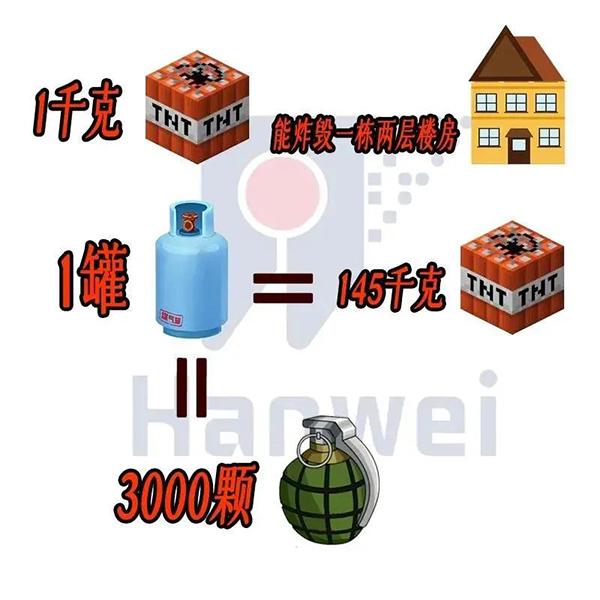 答:家用煤气罐一般是15公斤装,爆炸时相当于145公斤TNT炸药的威力。用手雷威力来对比,1个家用煤气罐(满罐)爆炸的破坏力相当于3000颗手雷。