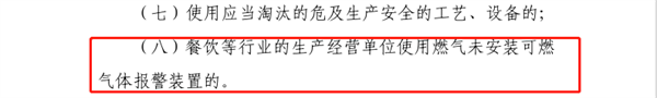 《中华人民共和国安全生产法》第三十六条规定“餐饮等行业的生产经营单位使用燃气的,应当安装可燃气体报警装置,并保障其正常使用”。