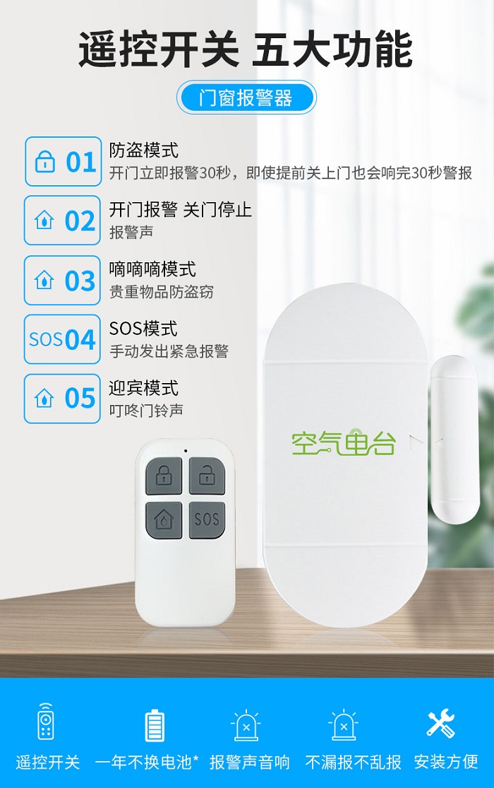 遥控门磁,门窗、抽屉,冰箱门都可用,120分贝报警声。布放模式,门铃模式,SOS模式